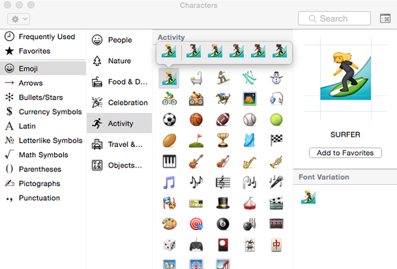 But what if you need a hidden character that isn’t in the Keyboard Viewer? For example, Ⓟ is commonly used on audio records (it stands for sound recording copyright), but it doesn’t have a keyboard shortcut. In that case, launch the Character Viewer, or choose Characters from the Action (gear) menu at the upper-left of the Fonts palette (summoned in most apps by choosing Format > Font or by pressing Command-T). You can also summon the Character Viewer by choosing Edit > Emoji & Symbols, or pressing Ctrl-Command-Space, in apps such as Pages, Keynote, and TextEdit.