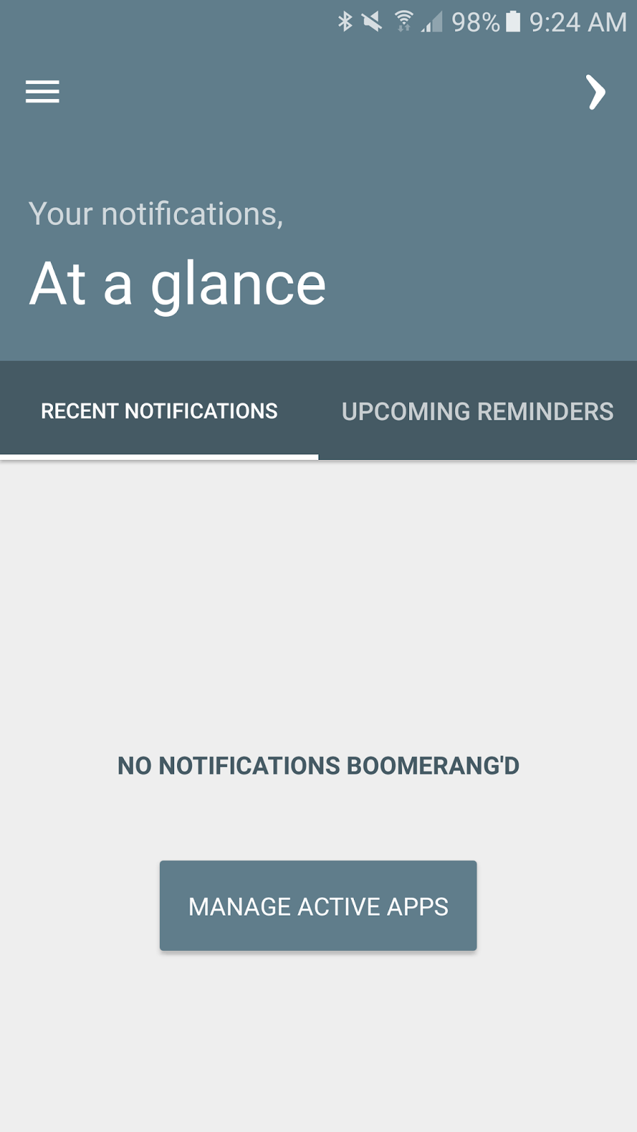 - Saved notifications, of course, can be viewed at any time. Boomerang has a persistent tile in your Notifications Shade, telling you how many saved items you have. A persistent tile is any tile that can’t be dismissed. In this case, Boomerang’s tile is optional. Tap it to check your saved notifications, as well as the upcoming reminders. You can even add a reminder for any saved notification by long-pressing it.